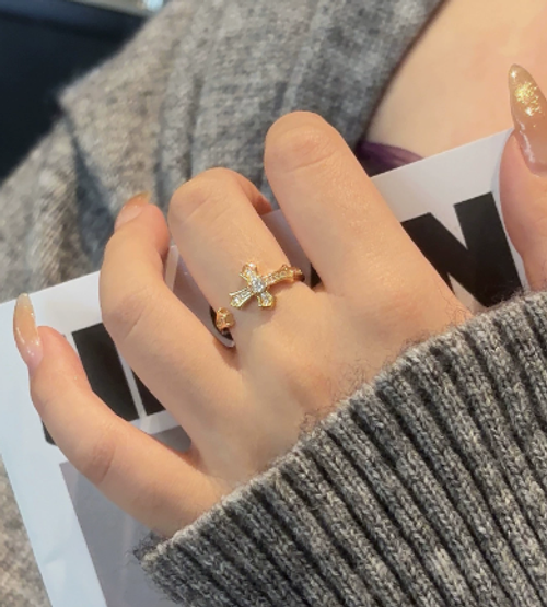 An open-band ring featuring a central cross motif, adorned with sparkling cubic zirconia—perfect for daily wear, keeping His care by your side.
