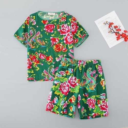 Bold Peony & Phoenix Print Summer Cool Suit, Lightweight Skin-Friendly Cotton Loungewear 2 Piece Short Set, Unisex Casual Outfit for Home & Outdoor