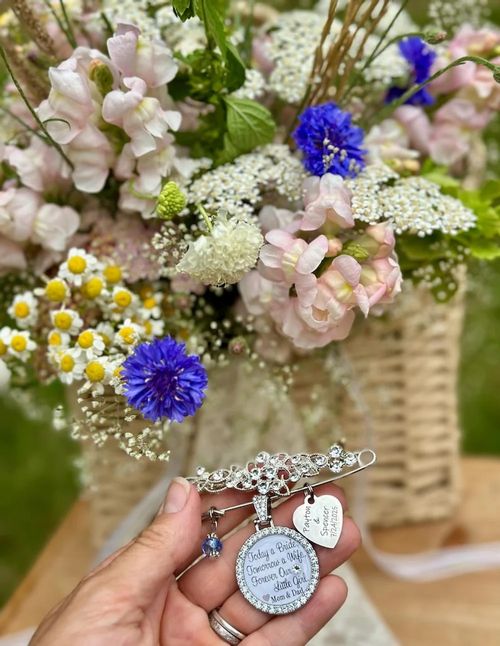 Custom Bridal Bouquet Charm with Name and Date, Today a Bride Something Blue Pin
