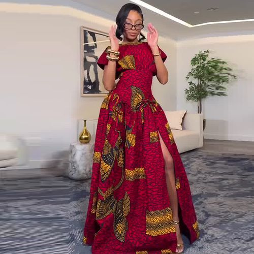 Printed, slit, red, fitted-waist, A-line maxi dress